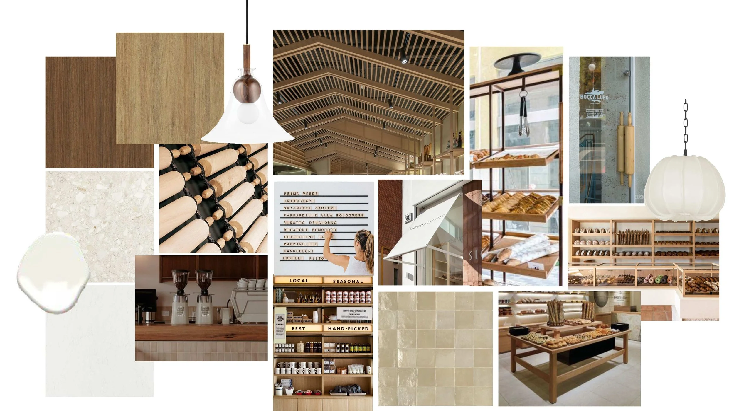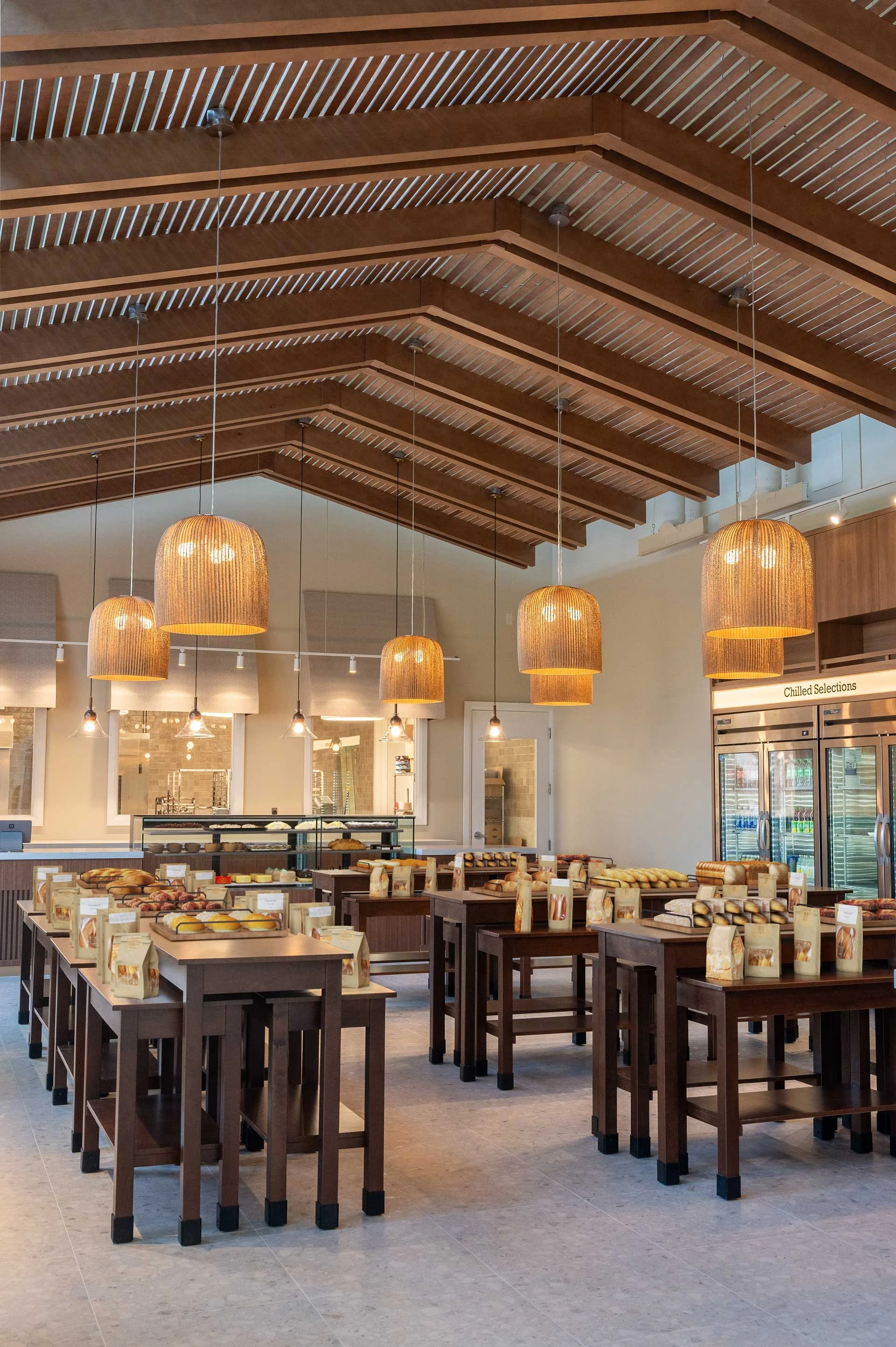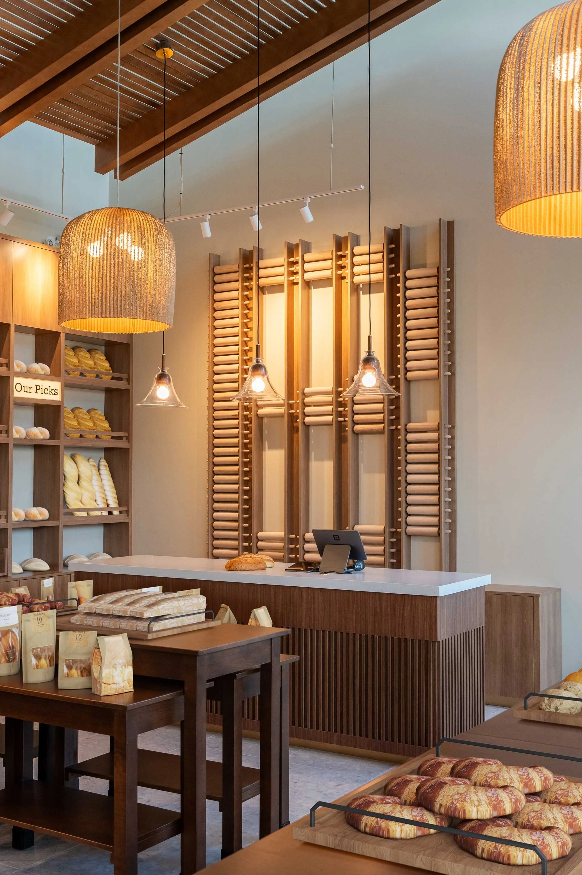 to an inviting, warm, bakery & cafe packed with rich texture and wood tones