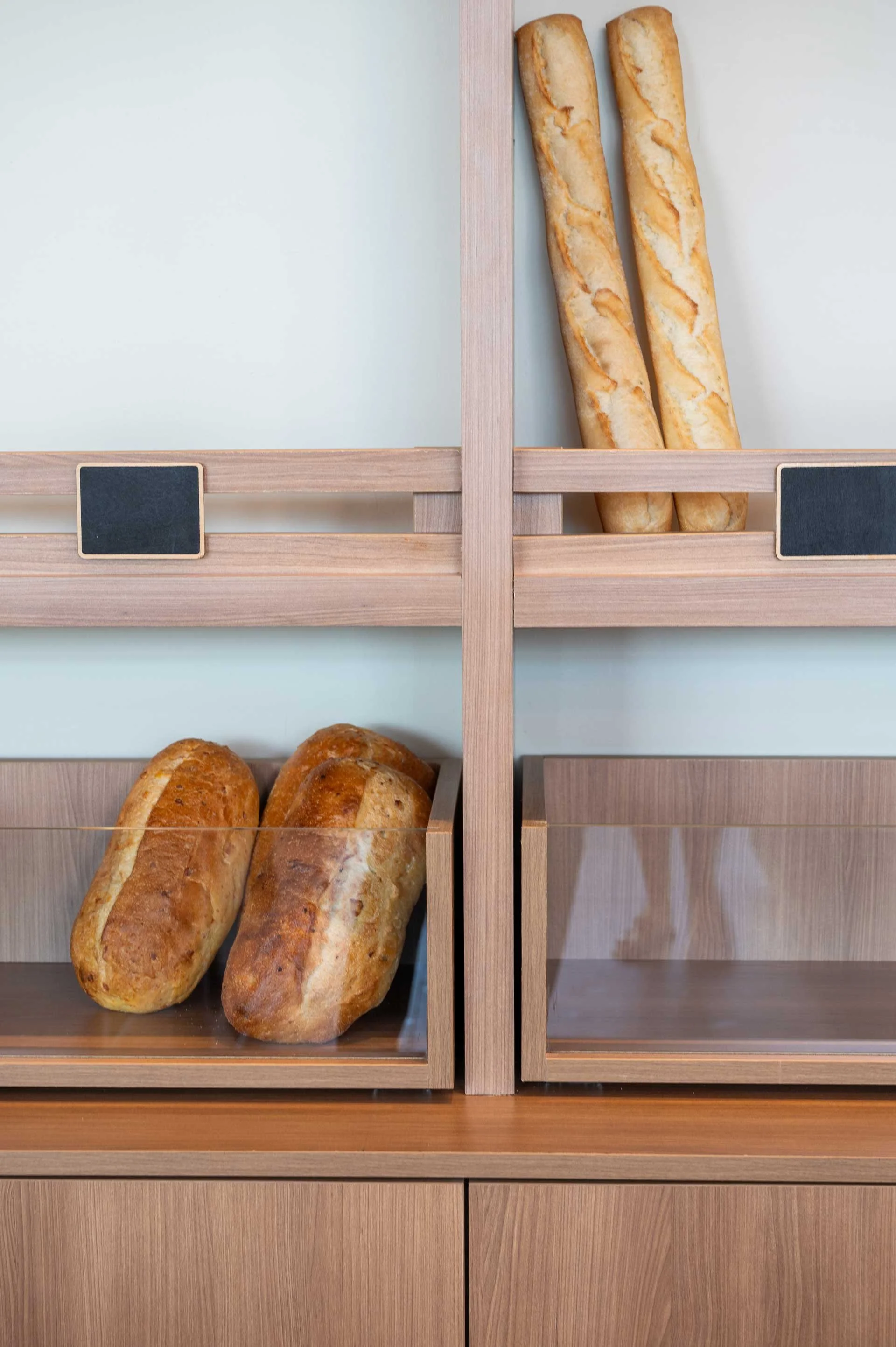 At Breadsource, it’s more than just picking up a loaf of bread and going on your way. They offer in-house bread slicing, packaging services, and freshly brewed coffee. Our layout had to support a variety of activities happening all at once. When we hit the drawing board, we carefully mapped out the flow for both the front and back of house. The bread slicing and packaging station was placed adjacent to the kitchen access for easy handling, while the coffee station was placed on the back wall, right in the customer’s line of sight as they first enter the shop, making it easy to grab a cup while browsing the displays.
