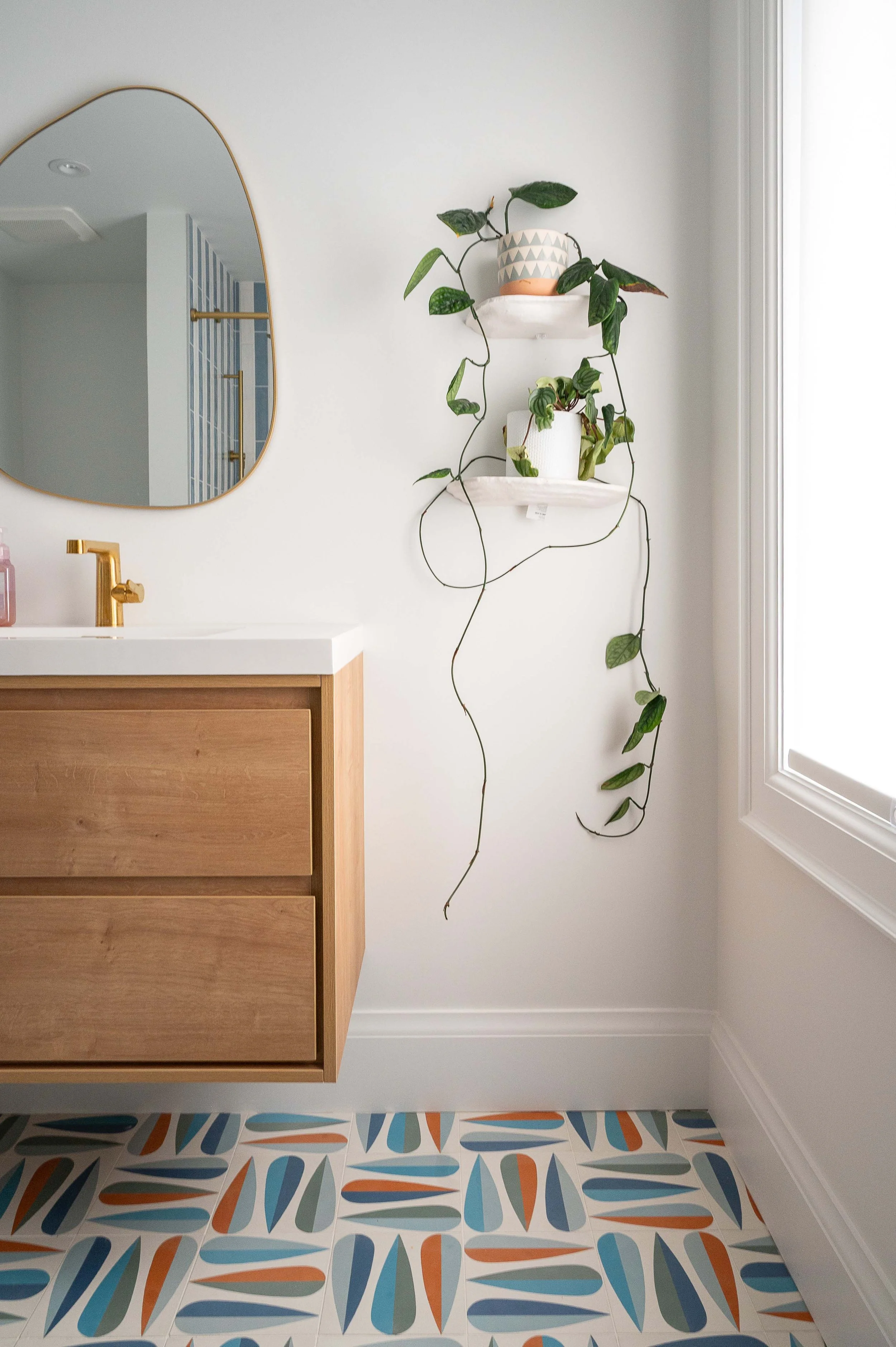 Despite its playful nature, the room maintains a polished cohesion through warm brass accents and a sleek wood tone floating double vanity. Finishing touches like handmade-style shelving, a marble wall sconce, and fresh greenery add layers of organic charm, ensuring the space feels curated rather than just 'busy’.