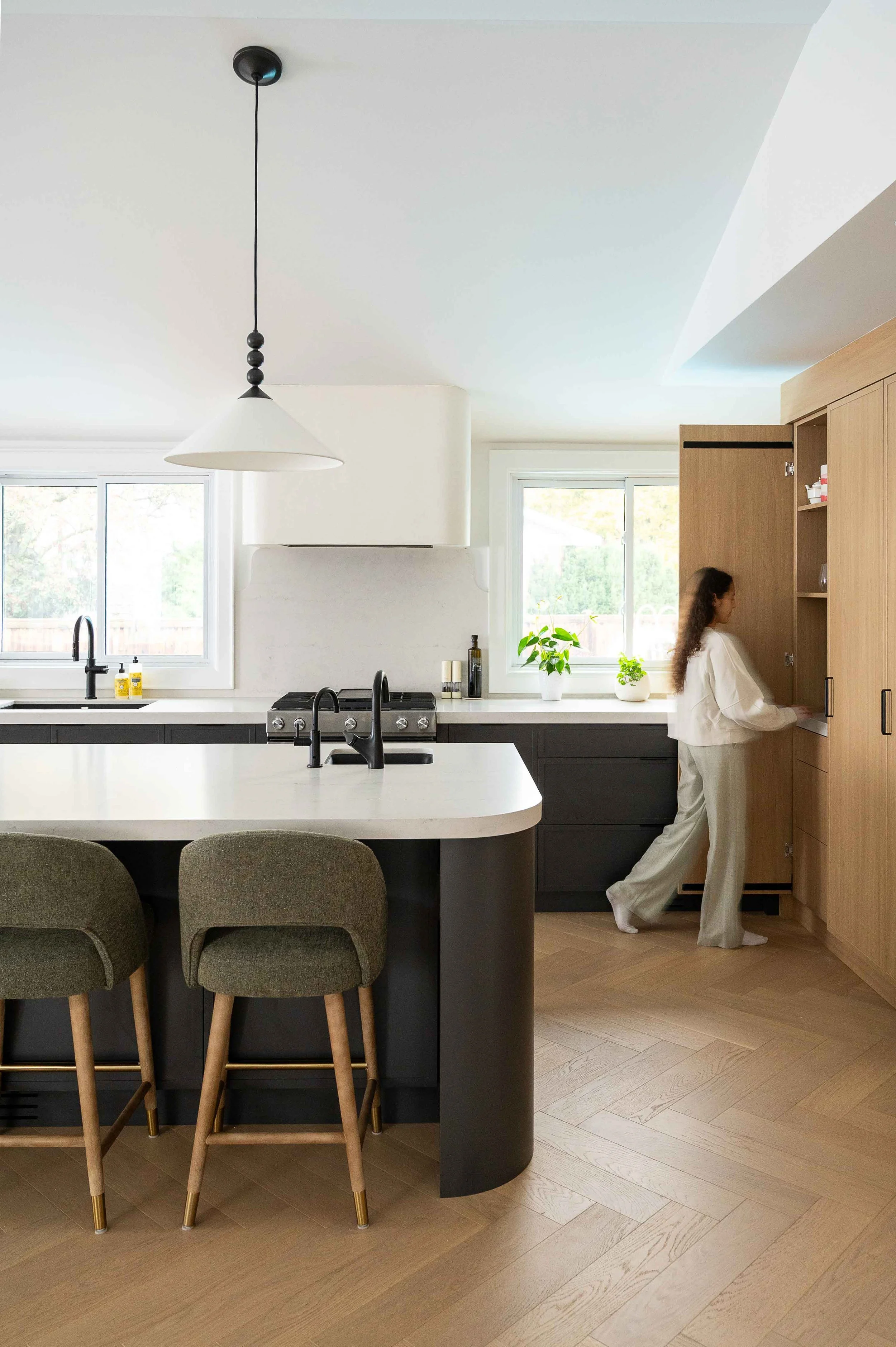 Departing from the standard all-white kitchen, we introduced deep charcoal cabinetry along the base perimeter to create a dynamic anchor for the space, offering a moody counterpoint to the airy, light-toned walls and large windows. The dark millwork, allows the 10-foot curved island to still remain as a focal point.