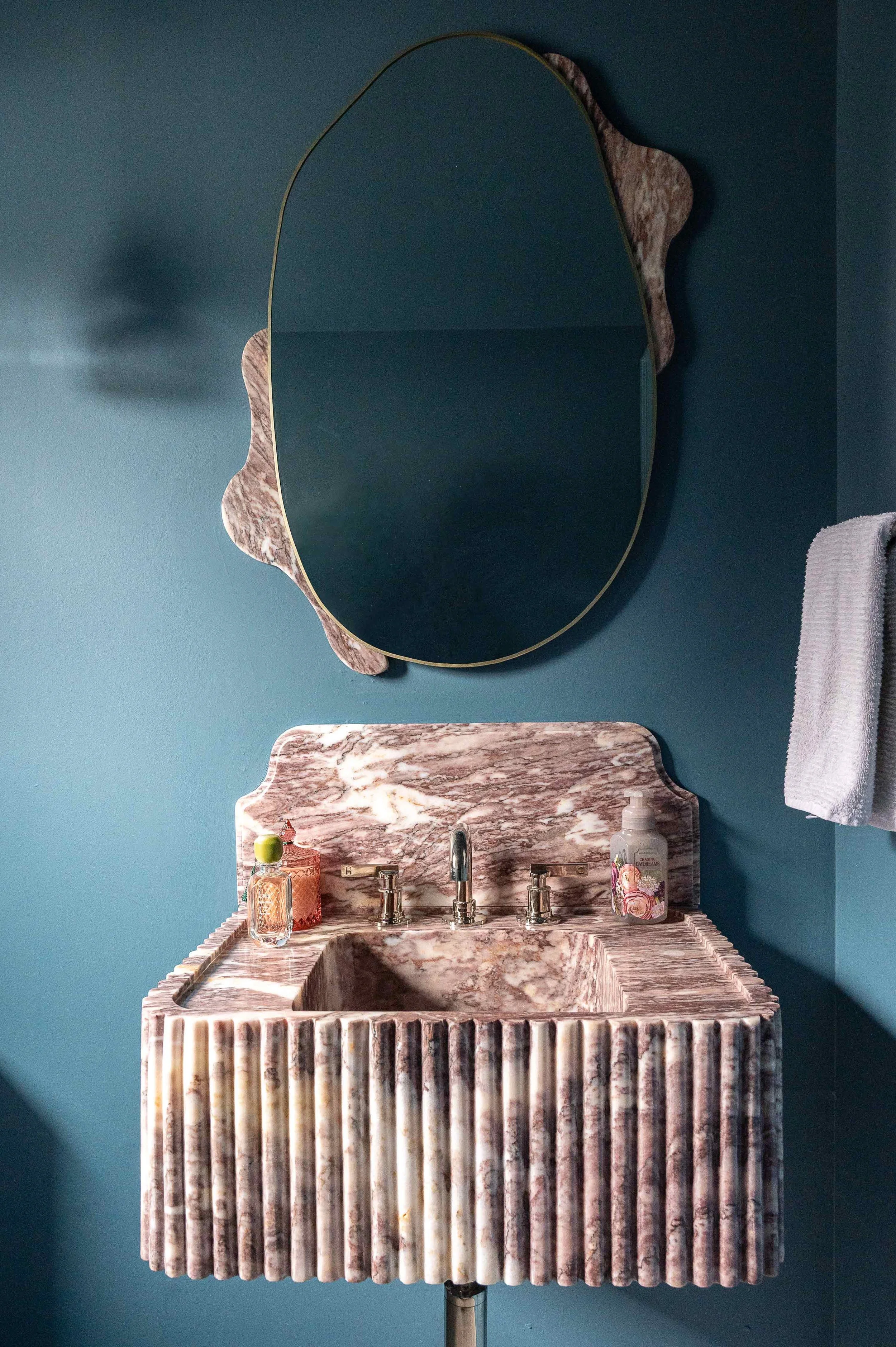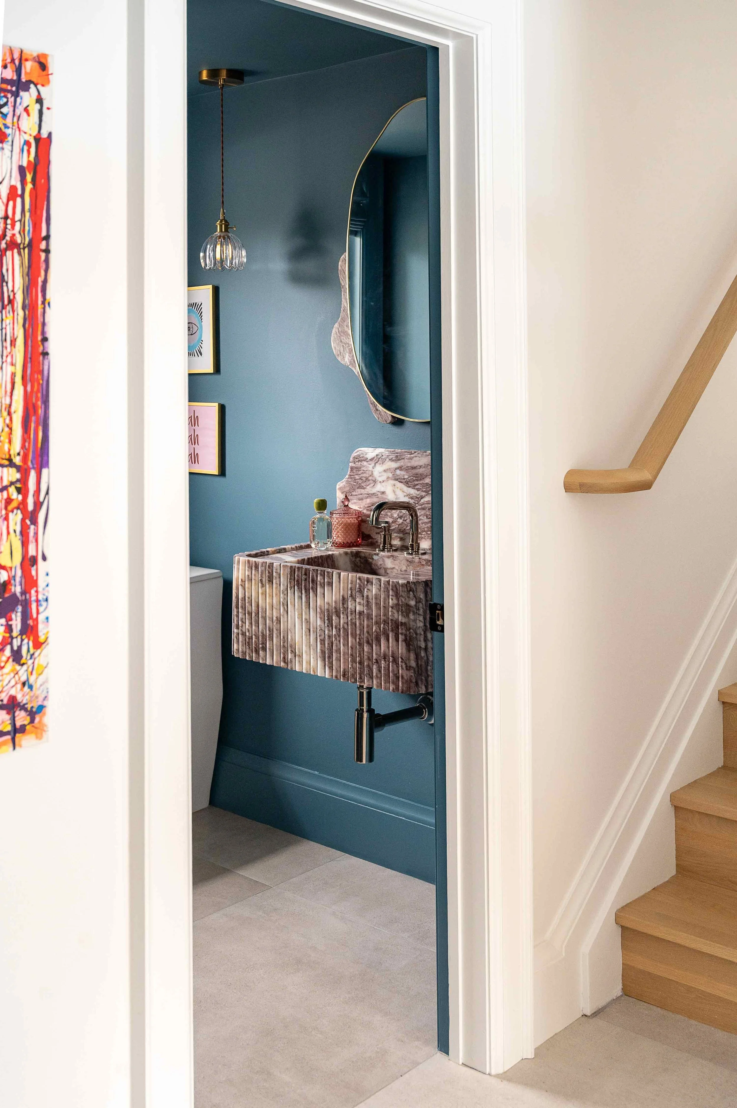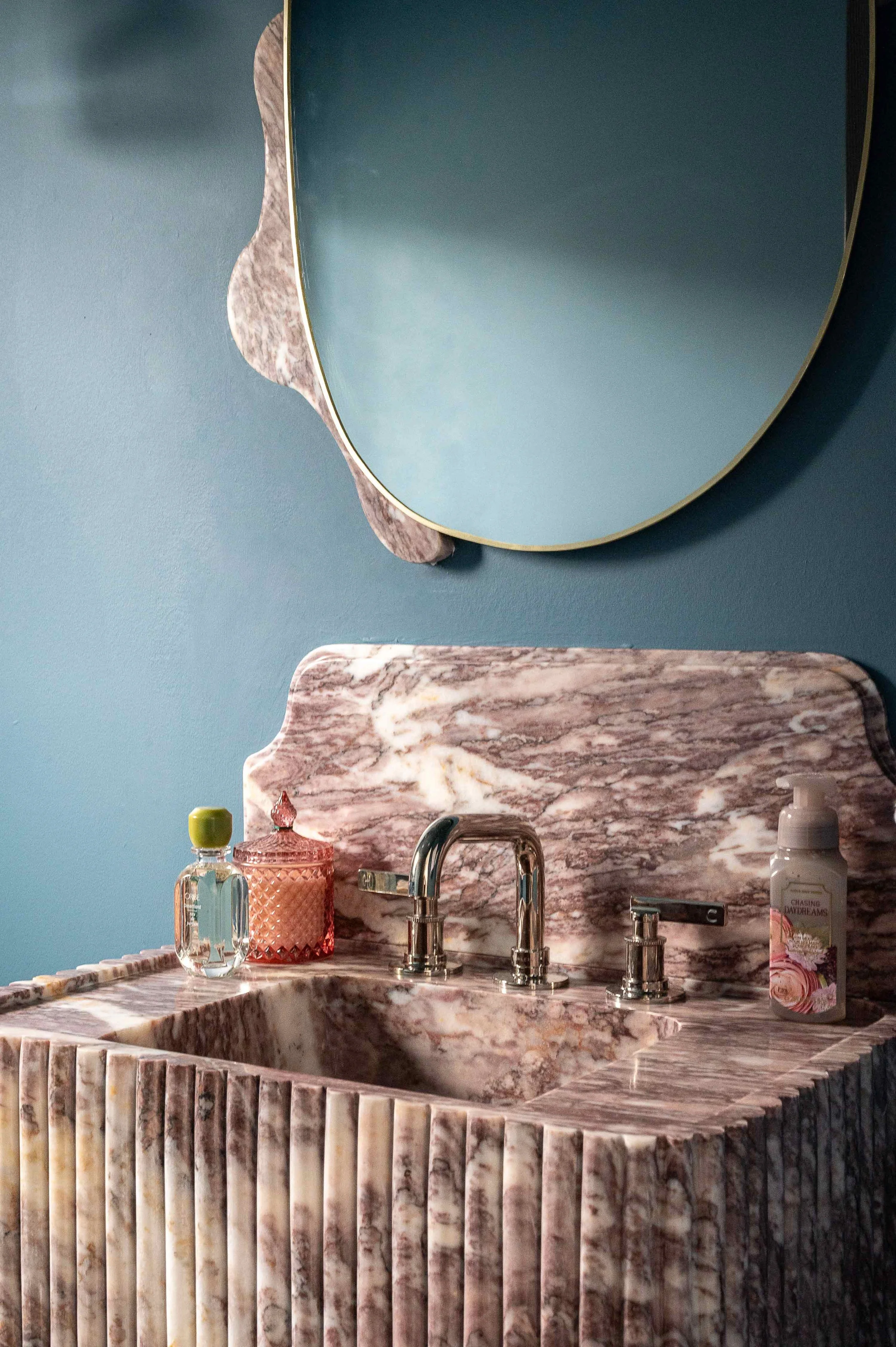 The powder room was designed to be unapologetically bold. Colour-drenched in a deep blue tone, we departed from the home's neutral palette to create a moody, high-impact experience. The space features a custom hand-carved fluted Purple Lilac marble floating sink, sourced from Turkey. A matching custom mirror echoes the sink’s curved silhouette, paired with polished nickel fixtures and p-trap.