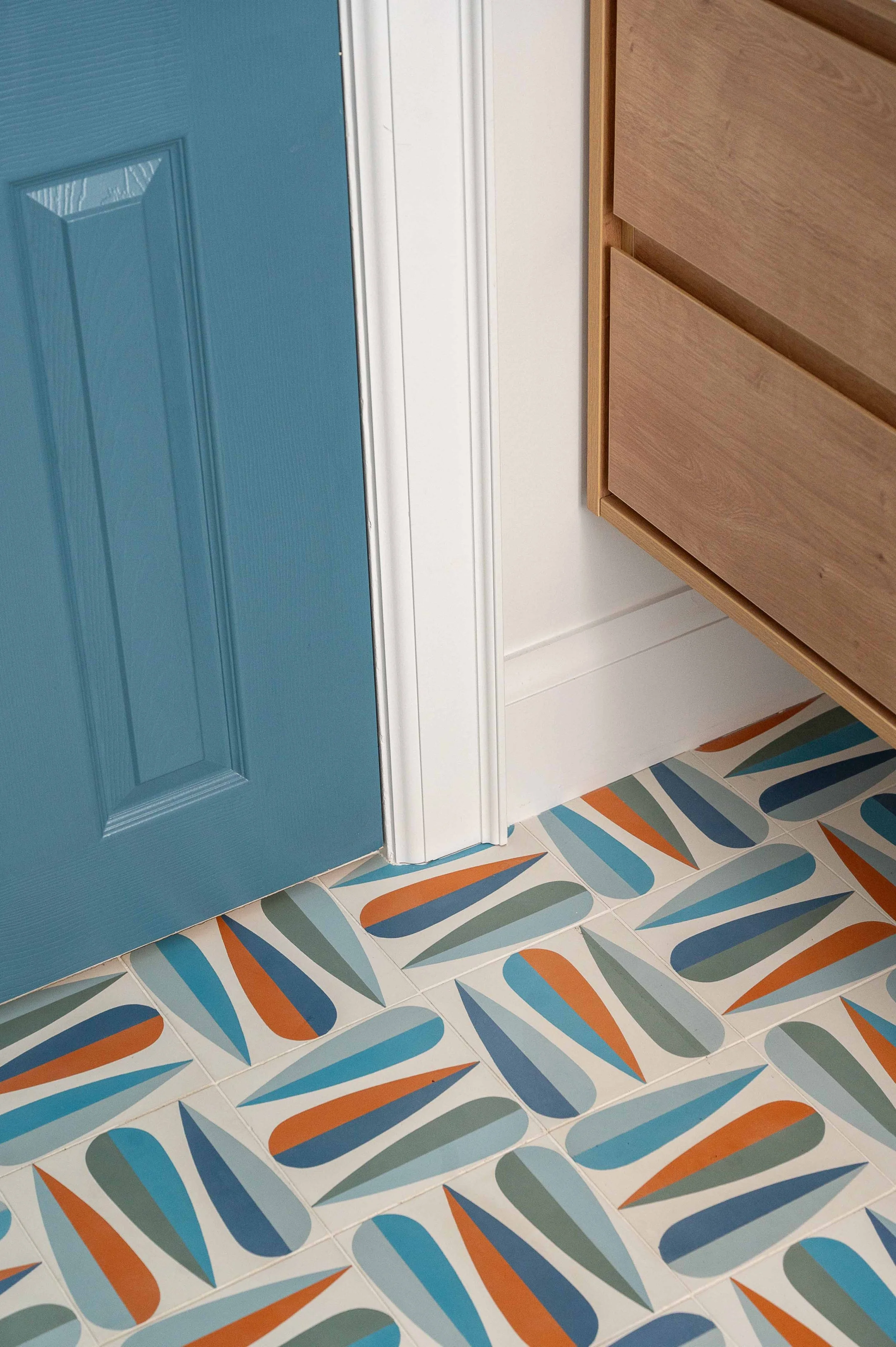 Designed to feel joyful and expressive, the main bathroom serves as a vibrant counterpoint to the home's neutral palette. We paired dynamic, colourful geometric floor tiles in earthy terracotta and blues with vertical blue-and-white striped wall tiles, creating a space that is bright, energetic, and perfect for kids or guests.