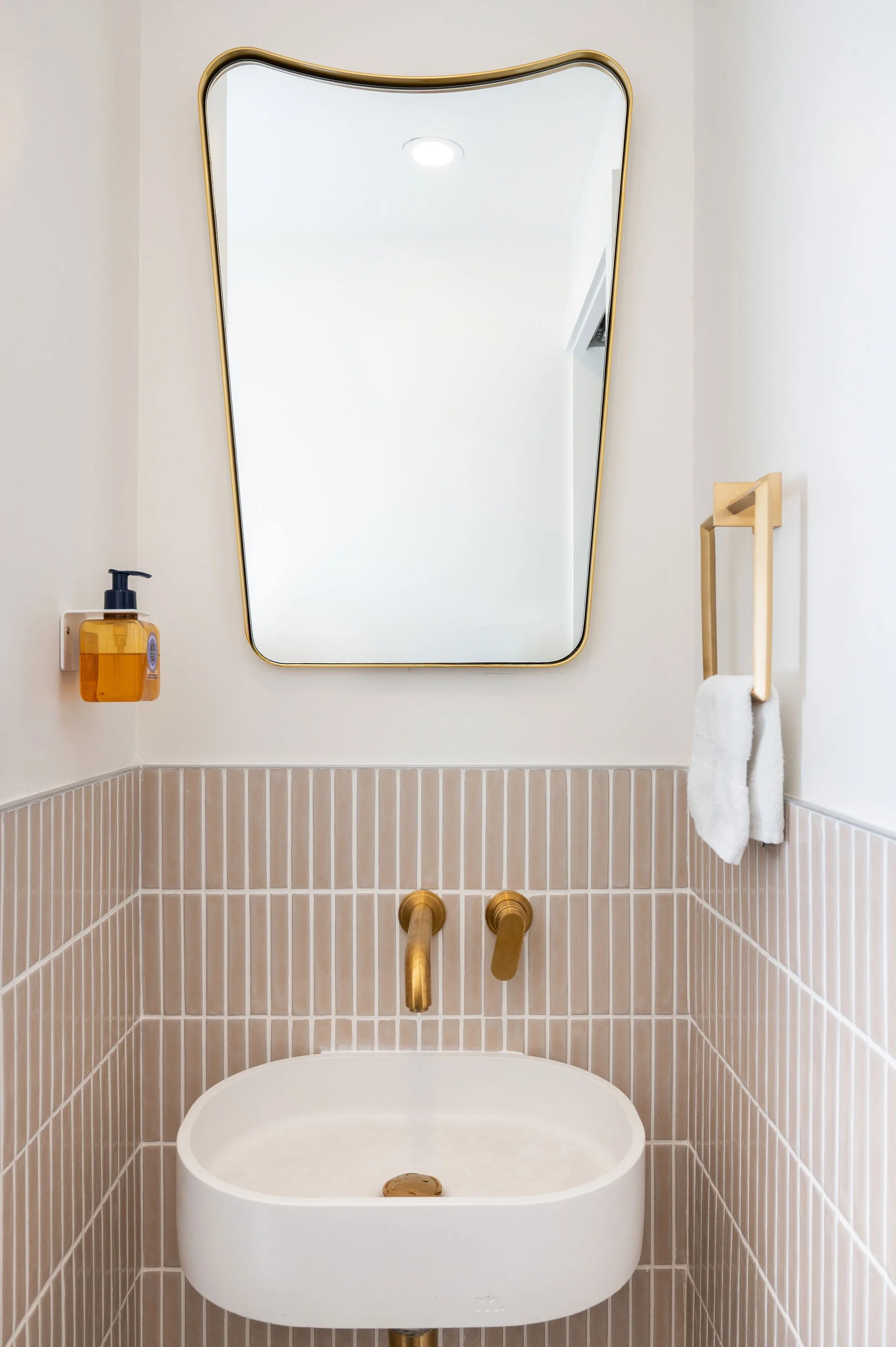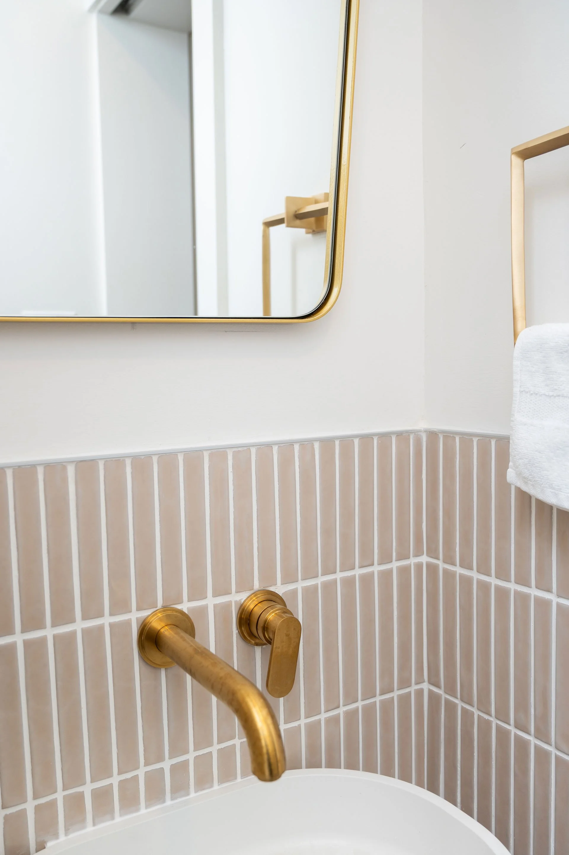 Because the space is small and windowless, we knew it needed a light, airy palette to keep it from feeling enclosed. We introduced a soft beige kit-kat tile halfway up the wall to bring in subtle texture and visual interest, while carrying over the brass accents used in the kitchen to create a sense of continuity throughout the home. The result is a compact yet thoughtfully detailed space that feels cohesive with the rest of the main floor.