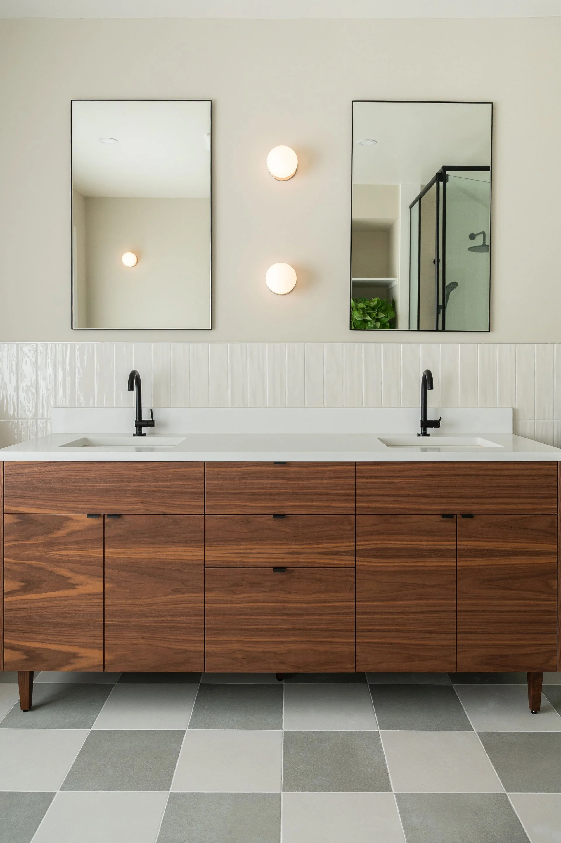 For the design direction, we leaned more contemporary than the rest of the home. Given the expansive floor area, we wanted the flooring to make a statement, so we chose a subtle checkered pattern in cream and warm light grey—elegant and sophisticated, rather than bold and stark like a classic black-and-white diner floor. Echoing the powder room, we used vertically stacked tile partway up the walls, but in this space opted for white tile with white grout. This creates a subtle accent, provides the water protection needed, and allows the floor pattern to remain the visual focal point.